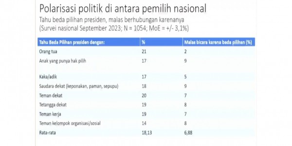 Telusur.co.id - Hanya 6,88% publik Indonesia terpolarisasi karena perbedaan pilihan presiden. Demikian temuan survei Saiful Mujani Research