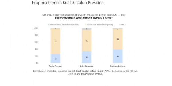 Telusur.co.id - Pemilih kuat pada Ganjar Pranowo 73 persen, Anies Baswedan 61 persen, dan Prabowo Subianto 59