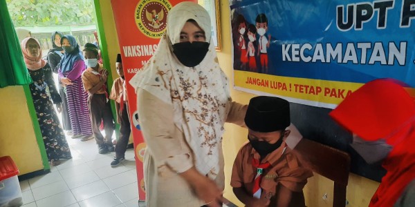 Telusur.co.id - Pelayanan vaksinasi Covid-19 untuk anak usia 6-11 tahun dilakukan di MI Darussalam, Jl. Jeruk Keputran