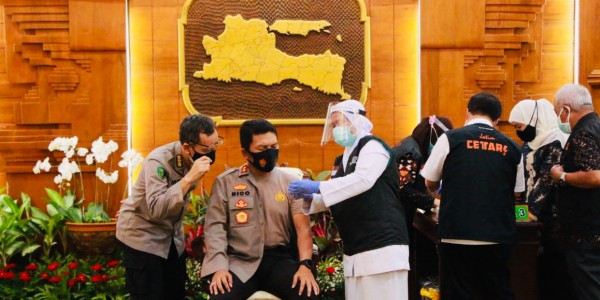 Telusur.co.id - Forkopimda Jawa Timur menjalani vaksinasi Covid-19 dosis kedua. Gubernur Jatim, Khofifah Indar Parawansa, dan Pangdam
