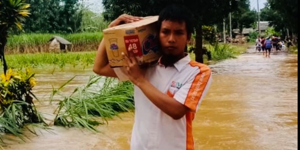 Telusur.co.id - Relawan Lembaga Amil Zakat Nasional Baitul Maal Hidayatullah (BMH) nekat menyembrangi banjir yang terjadi di
