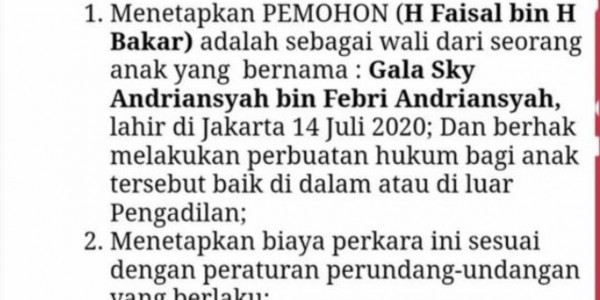 Telusur.co.id - Pengadilan Agama Jakarta Barat telah memutuskan hak asuh perwalian Gala Sky, putra dari mendiang Vanessa Angel