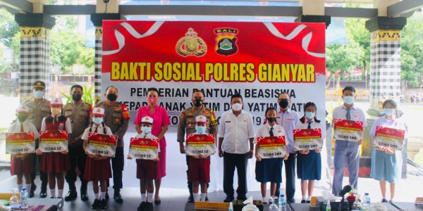 Telusur.co.id - Polres Gianyar menggelar bakti sosial (Baksos) dengan memberikan beasiswa kepada anak yatim dan yatim piatu